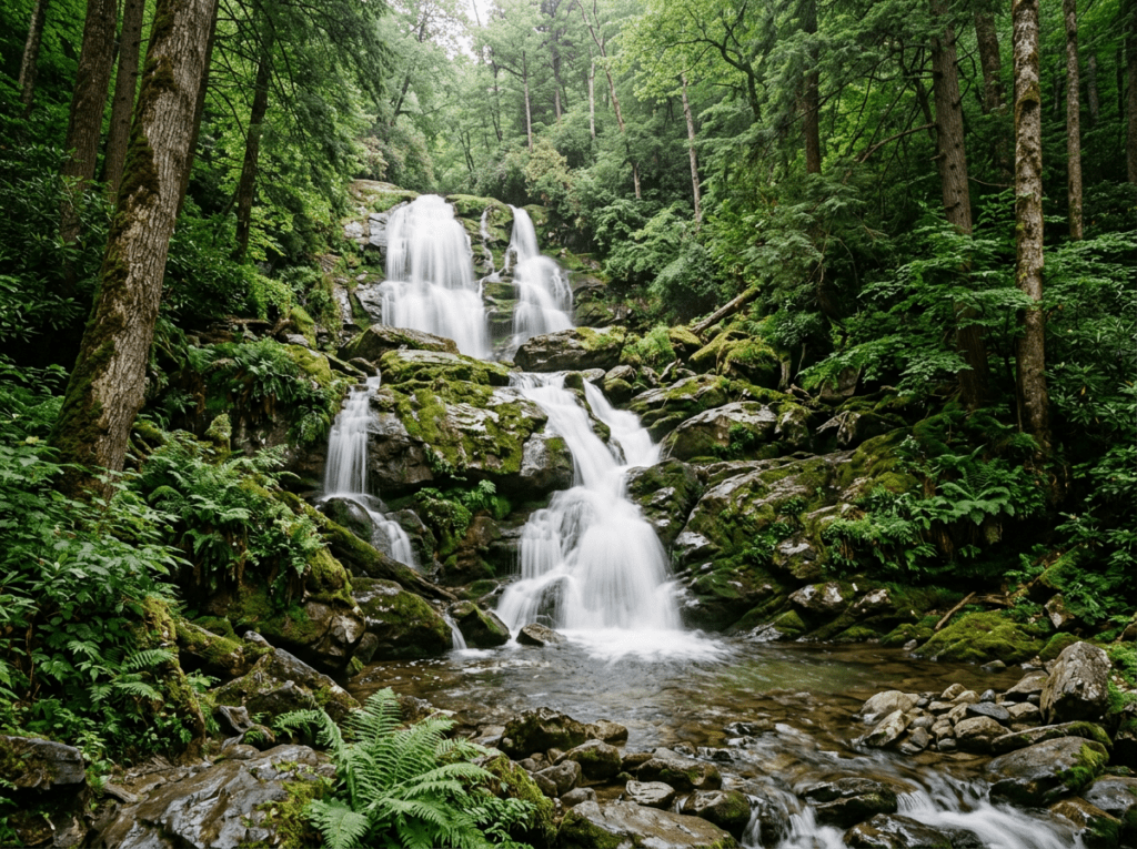 Waterfall photography in the Smokies operates on a different schedule entirely — it is less light-dependent and more flow-dependent, and the best conditions are the overcast days that most visitors write off as disappointing. An overcast sky over a waterfall in old-growth forest eliminates the harsh contrast between bright water and deep shadow that makes sunlit waterfall photography technically difficult. It also saturates the greens of the moss and fern and rhododendron surrounding the falls in a way that direct sun cannot. Ramsey Cascades, a 100-foot cascade deep in old-growth hemlock forest on the eastern side of the park, is the most spectacular of the park’s falls and worth the 8-mile round trip hike on a gray morning in spring when the flow is at its peak.