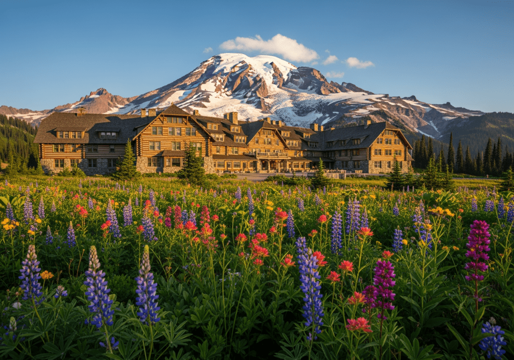 Paradise Inn, inside the park at the Paradise area, is the landmark in-park lodging — a 1917 National Historic Landmark with a massive timber-frame great room, stone fireplace, and the kind of mountain lodge character that no contemporary hotel can replicate. The location puts you at the wildflower meadow trailheads without a commute, which for the early morning and late evening photography windows is worth every dollar of the premium. It books out for peak season well in advance; the reservation opening in January is the time to move on it.