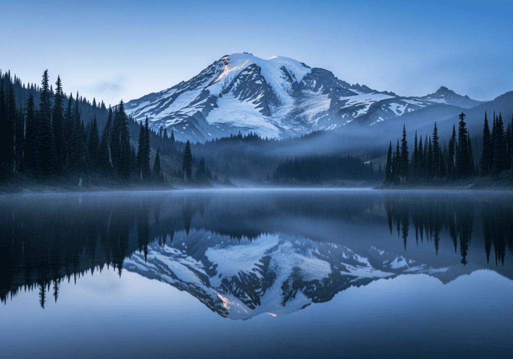 Reflection Lake, on the road between Paradise and the Stevens Canyon entrance, provides the mountain reflection photography that Paradise cannot — a small subalpine lake that, on calm mornings before the wind comes up, reflects the full summit and glacier system in its surface. The window for the perfect reflection is often less than thirty minutes, when the wind is still and the light is right and the surface of the lake is undisturbed. This is the kind of photograph that cannot be manufactured or waited out once the wind arrives. It has to be found in the first light of a clear morning by someone who is already there.